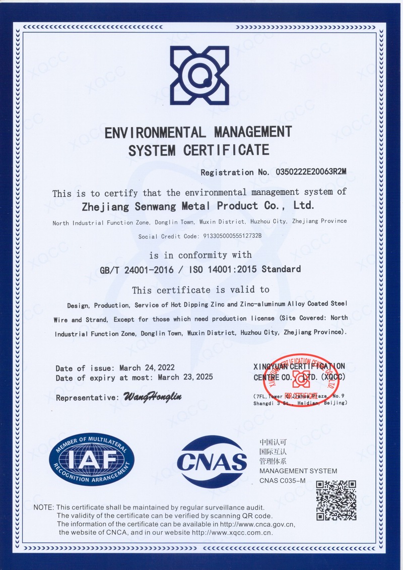 浙江森旺金屬制品有限公司成立于2012年,坐落湖州市吳興區東林鎮工業功能區。公司專業從事各類鍍鋅鋼絲、鋼絞線等產品的開發及生產。目前產品已廣泛應用于各類通信光電纜,電力輸送,電氣化鐵路工程,各類堤壩防護及農業溫室等工程領域。公司秉承“追求卓越品質,創建卓著信譽”的經營理念,始終堅持專業化、規模化的經營模式。
